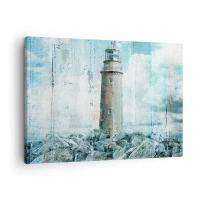 Obraz na plátne - Maják na skalnatom pobreží v pastelových farbách - 70x50cm - Na starom dreve - Moderná nástenná dekorácia do obývacej izby a spálne ARTTOR