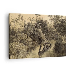 Obraz na plátne - Kresba džungle s loďou na rieke - 70x50cm - Výlet k zdroju - Moderná nástenná dekorácia do obývacej izby a spálne ARTTOR