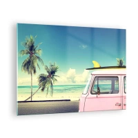 Obraz na skle - Pláž s palmami a ružovou retro dodávkou pri mori - 70x50cm - Prázdniny, je čas začať - Moderná nástenná dekorácia do obývacej izby a spálne ARTTOR