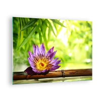 Obraz na skle - Fialový lotosový kvet na bambusovej doske so zeleným pozadím - 70x50cm - Na ázijskom slnku - Moderná nástenná dekorácia do obývacej izby a spálne ARTTOR