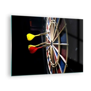 Obraz na skle - Šípky zasiahnu cieľ v tmavom prostredí - 70x50cm - Presný zásah - Moderná nástenná dekorácia do obývacej izby a spálne ARTTOR