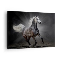 Obraz na plátne - Biely kôň cválajúci na tmavom pozadí - 70x50cm - Sivé je krásne - Moderná nástenná dekorácia do obývacej izby a spálne ARTTOR