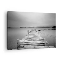 Obraz na plátne - Čiernobiely pohľad na drevené mólo a pokojné jazero. - 70x50cm - Za horami, za morom - Moderná nástenná dekorácia do obývacej izby a spálne ARTTOR
