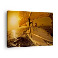 Obraz na plátne - Plachetnica na mori pri západe slnka, zlatá žiara. - 70x50cm - Zlatý večer po viacfarebnom dni - Moderná nástenná dekorácia do obývacej izby a spálne ARTTOR