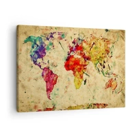 Obraz na plátne - Mapa sveta v farebnej akvarelovej interpretácii - 70x50cm - Všetky farby sveta - Moderná nástenná dekorácia do obývacej izby a spálne ARTTOR