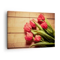 Obraz na plátne - Kytica ružových tulipánov na drevenom pozadí - 70x50cm - Jarné vyznanie - Moderná nástenná dekorácia do obývacej izby a spálne ARTTOR