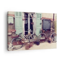 Obraz na plátne - Staré bicykle pred drevenými dverami s pastelovými okenicami - 70x50cm - Nech žije provincia - Moderná nástenná dekorácia do obývacej izby a spálne ARTTOR