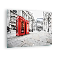 Obraz na skle - Červené telefónne búdky na pozadí mestskej ulice - 70x50cm - Welcome to London - Moderná nástenná dekorácia do obývacej izby a spálne ARTTOR