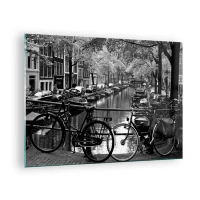 Obraz na skle - Čiernobiely pohľad na kanál s bicyklami a loďkami - 70x50cm - Veľmi holandský výhľad - Moderná nástenná dekorácia do obývacej izby a spálne ARTTOR
