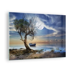 Obraz na skle - Osamelá loď pri strome na pozadí mesiaca - 70x50cm - Je to koniec alebo začiatok? - Moderná nástenná dekorácia do obývacej izby a spálne ARTTOR