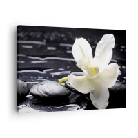 Obraz na plátne - Biela orchidea na pozadí čiernych kameňov a vody. - 70x50cm - Štúdia v čiernej a bielej - Moderná nástenná dekorácia do obývacej izby a spálne ARTTOR