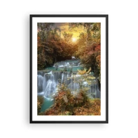 Plagát v čiernom ráme - Vodopád obklopený jesennými stromami pri západe slnka - 50x70cm - Ukrytý poklad lesa - Moderná nástenná dekorácia do obývacej izby a spálne ARTTOR