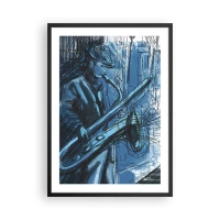 Plagát v čiernom ráme - umelecký náčrt hudobníka hrajúceho na saxofón - 50x70cm - Mestská rapsódia - Moderná nástenná dekorácia do obývacej izby a spálne ARTTOR