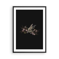 Plagát v čiernom ráme - Žeriav obklopený kvitnúcimi konármi na čiernom pozadí - 50x70cm - Exotický vyšívaný vták - Moderná nástenná dekorácia do obývacej izby a spálne ARTTOR