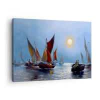 Obraz na plátne - Lode s plachtami na pokojnej vode pri západe slnka - 70x50cm - Nočný rybolov - Moderná nástenná dekorácia do obývacej izby a spálne ARTTOR
