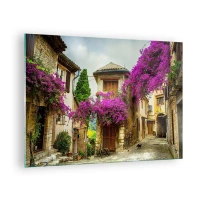 Obraz na skle - Farebná ulica s kvitnúcimi rastlinami a svetlom - 70x50cm - Impresia - talianska ulička - Moderná nástenná dekorácia do obývacej izby a spálne ARTTOR