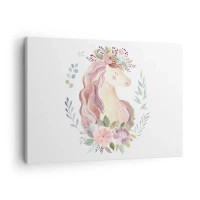 Obraz na plátne - Jednorožec v pastelových farbách obklopený kvetmi - 70x50cm - Pozvánka do ríše rozprávok - Moderná nástenná dekorácia do obývacej izby a spálne ARTTOR