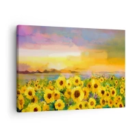 Obraz na plátne - Pole slnečníc vo svetle zapadajúceho slnka - 70x50cm - Samotné slnko zostúpilo na zem - Moderná nástenná dekorácia do obývacej izby a spálne ARTTOR
