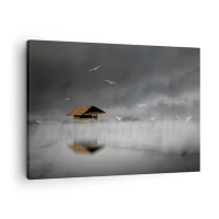 Obraz na plátne - Osamelá chata pri vode obklopená hmlou a vtákmi - 70x50cm - Úkryt pred dažďom - Moderná nástenná dekorácia do obývacej izby a spálne ARTTOR