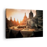 Obraz na plátne - Socha Budhu v chráme Borobudur pri západe slnka - 70x50cm - Počasie veľkej múdrosti - Moderná nástenná dekorácia do obývacej izby a spálne ARTTOR