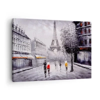 Obraz na plátne - Pohľad na Eiffelovu vežu v monochromatickom prostredí s farebnými akcentmi - 70x50cm - Parížska prechádzka - Moderná nástenná dekorácia do obývacej izby a spálne ARTTOR