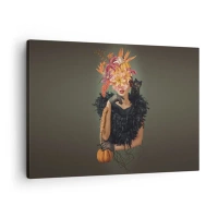 Obraz na plátne - Portrét ženy s jesennými motívmi a mačkou - 70x50cm - Kúzlo čarodejnice - Moderná nástenná dekorácia do obývacej izby a spálne ARTTOR
