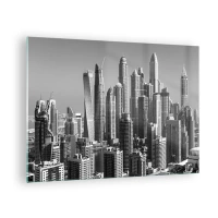 Obraz na skle - Čiernobiela panoráma mestských mrakodrapov - 70x50cm - Mesto nad púšťou - Moderná nástenná dekorácia do obývacej izby a spálne ARTTOR