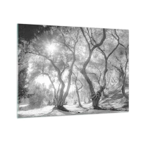 Obraz na skle - Čierne a biele olivovníky na slnečnom svetle - 70x50cm - V olivovom háji - Moderná nástenná dekorácia do obývacej izby a spálne ARTTOR