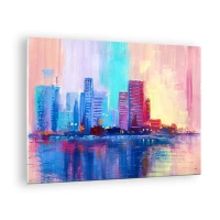 Obraz na skle - Moderné mesto v intenzívnych farbách odrážajúcich sa vo vode - 70x50cm - Vykúpané vo farbách - Moderná nástenná dekorácia do obývacej izby a spálne ARTTOR