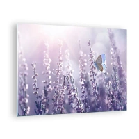 Obraz na skle - Motýľ v levanduľovom poli na slnku - 70x50cm - Bozk motýľa - Moderná nástenná dekorácia do obývacej izby a spálne ARTTOR