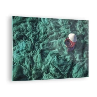 Obraz na skle - Žena v tradičnom klobúku opravuje siete - 70x50cm - V mori sietí - Moderná nástenná dekorácia do obývacej izby a spálne ARTTOR