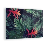 Obraz na skle - Exotické listy a kvety na tmavom pozadí - 70x50cm - Vzplanúť v zelenom - Moderná nástenná dekorácia do obývacej izby a spálne ARTTOR
