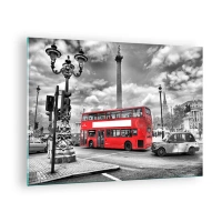 Obraz na skle - Červený autobus na pozadí čiernobielej mestskej krajiny - 70x50cm - Skutočný krvný obeh mesta - Moderná nástenná dekorácia do obývacej izby a spálne ARTTOR