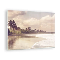 Obraz na skle - Zlatá pláž s palmami a pokojným oceánom v jemnom svetle - 70x50cm - Pohladenie vĺn - Moderná nástenná dekorácia do obývacej izby a spálne ARTTOR