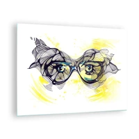 Obraz na skle - Okuliare s umeleckými vzormi a očami na žltom pozadí - 70x50cm - Cez modré okuliare - Moderná nástenná dekorácia do obývacej izby a spálne ARTTOR