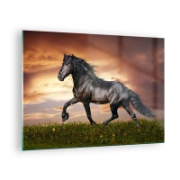 Obraz na skle - Čierny kôň cválajúci proti zapadajúcemu slnku - 70x50cm - Čierny knieža - Moderná nástenná dekorácia do obývacej izby a spálne ARTTOR