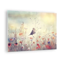 Obraz na skle - Vták na kvetnatej lúke na slnku - 70x50cm - Portrét vtáka s lúkou v pozadí - Moderná nástenná dekorácia do obývacej izby a spálne ARTTOR