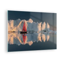 Obraz na skle - Plachetnica s červenou plachtou blízko ľadovcov pri západe slnka - 70x50cm - Na okraji sveta - Moderná nástenná dekorácia do obývacej izby a spálne ARTTOR