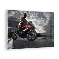 Obraz na skle - Motocyklista na pretekárskej dráhe pod búrlivou oblohou - 70x50cm - Temný jazdec - Moderná nástenná dekorácia do obývacej izby a spálne ARTTOR