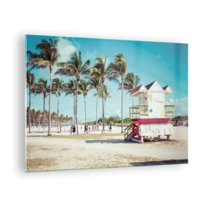 Obraz na skle - Pláž s palmami a vežou plavčíkov za slnečného dňa - 70x50cm - Čaká ťa krásny deň - Moderná nástenná dekorácia do obývacej izby a spálne ARTTOR