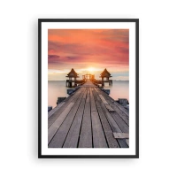 Plagát v čiernom ráme - Drevené mólo so západom slnka nad vodou v pozadí - 50x70cm - Západ na východe - Moderná nástenná dekorácia do obývacej izby a spálne ARTTOR