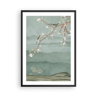 Plagát v čiernom ráme - Vtáky na kvitnúcej vetve s výhľadom na kopce - 50x70cm - Jar je tu - Moderná nástenná dekorácia do obývacej izby a spálne ARTTOR