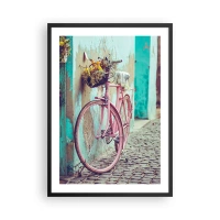 Plagát v čiernom ráme - Ružový bicykel s košíkom na rustikálnej ulici - 50x70cm - Hneď sa vrátim - Moderná nástenná dekorácia do obývacej izby a spálne ARTTOR