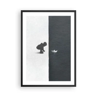 Plagát v čiernom ráme - Dieťa sa nakláňa nad vodu s papierovou loďkou - 50x70cm - Veľká výprava - Moderná nástenná dekorácia do obývacej izby a spálne ARTTOR