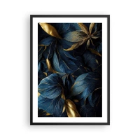 Plagát v čiernom ráme - Zlaté listy na tmavo modrom pozadí - 50x70cm - Podšívané zlatom - Moderná nástenná dekorácia do obývacej izby a spálne ARTTOR