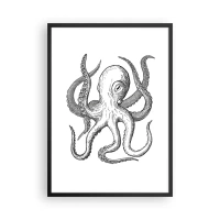 Plagát v čiernom ráme - Čiernobiela ukážka chobotnice - 50x70cm - Tancujúca s vlnami - Moderná nástenná dekorácia do obývacej izby a spálne ARTTOR