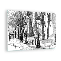 Obraz na skle - Čiernobiela kresba mestskej ulice s lampášmi - 70x50cm - Milostný príbeh alebo horor? - Moderná nástenná dekorácia do obývacej izby a spálne ARTTOR