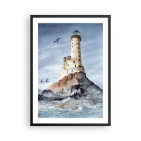 Plagát v čiernom ráme - Akvarelová maľba majáka na skalnatom pobreží - 50x70cm - Nepremožiteľná - Moderná nástenná dekorácia do obývacej izby a spálne ARTTOR
