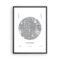 Plagát v čiernom ráme - Minimalistická mapa Los Angeles v čiernobielej farbe. - 50x70cm - Anatómia Los Angelesu - Moderná nástenná dekorácia do obývacej izby a spálne ARTTOR