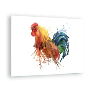 Obraz na skle - Akvarelový kohút v živých farbách na bielom pozadí - 70x50cm - Kráľovský šat, kráľovská pýcha - Moderná nástenná dekorácia do obývacej izby a spálne ARTTOR